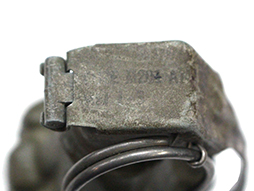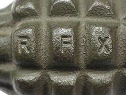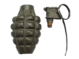 Mk II手榴弾は第一次世界大戦時に使用されたMk 1手榴弾の改良型で第二次世界大戦、朝鮮戦争、ベトナム戦争で広く使用されました。 形状から「パイナップル」と呼ばれました。 冷戦中も多くの西側諸国で使用され、自衛隊もMk2破片手榴弾として採用しました。 本品は訓練用で、金属鋳造製の本体にRFXの文字が確認できます。 元々訓練用手榴弾として製造されたもので、内部に火薬等の入っていない安全な品です。 セーフティ・レバーには数字らしきものが見られますが腐食の為、見難くなっています。 レバーには塗装の剥落している箇所が見られます。 また、セーフティ・ピンには経年に伴う錆が発生しています。 内部のネズミ捕り式の撃発装置は除去されています。 またピンを留める針金が短くなっています。 本体や信管に火薬等の一切入っていない安全品です。 (AW)- 詳細画像