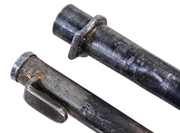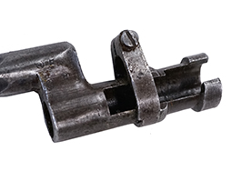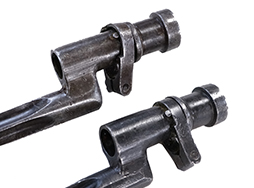 使用感とそれに伴う経年が感じられ、銃剣本体はすれや小傷が散見されます。 基部周辺には複数の刻印が打刻されています。 鉄製の鞘は凹みが散見されますが、抜き差しには問題なくギュッと押し込むと銃剣をしっかりと保持します。 個体によって多少のコンディションの差がみられ、黒染めがしっかりと残っている個体や、地金っぽくなっている個体がございます。 (YS)