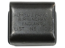 リー・エンフィールド No.4 小銃に使用されるフロント・サイト・カバーで、金属の弾性を利用してフロント・サイト・ガード部に装着します。 カバー上面には「ALFRED J. PARKER BIRMINGHAM ENGLAND LIST No 102」の刻印が見られます。 カバーには若干の表面錆や角部に表面仕上げが薄くなっている箇所が見られるものの、全体的にはブルー仕上げが残っており、大きな破損や変形の見られない状態が保たれています。 (TK)