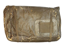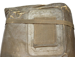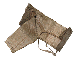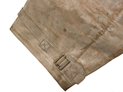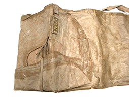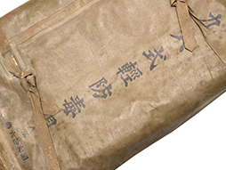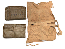 陸軍九六式全防毒具です。 「九六式全防毒具 昭和拾六」の文字のある破れのある布製袋にゴム引きの防毒衣(一つには「旧六式軽防毒具 昭和拾六」と記載があります)が2つ収納されています。ゴム部分に硬化が見られ、無理に広げようとすると破損の恐れがあります、希少な品ですので資料などに如何でしょうか。