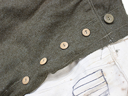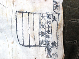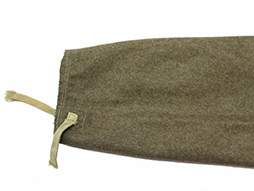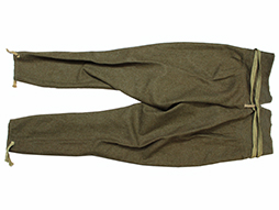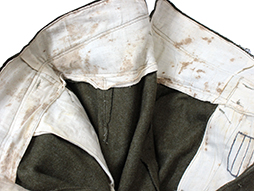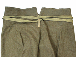 入隊すると官給品として支給された陸軍下士官兵用三式軍袴です。 内側には「三式、大号、昭和十九年製、大支検定」などの検印が見られます、記名欄に記載はありません。 経年による褪色や擦れ、内側にはシミが多々は見られますが、全体に程度の良い状態の品です。 裾紐、腰紐も完全です。