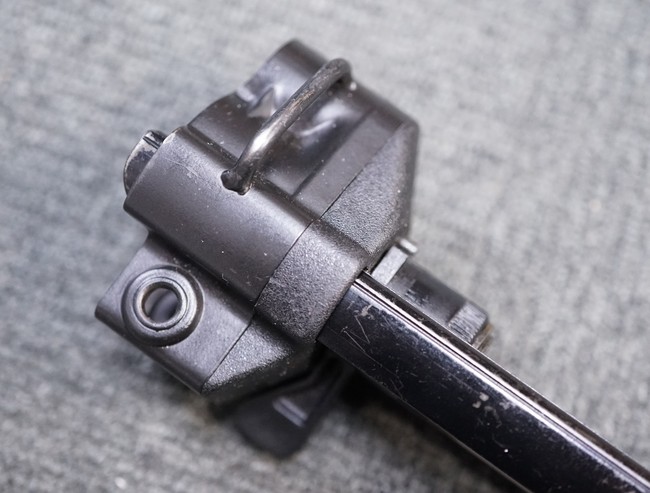 HK33用のリトラクタブル・ストックで、MP5向けよりも全伸縮部分が長いため全長も長くなっています。 MP5には取り付けできますが、MP5では伸縮部分の溝の長さが足りないため縮め切ることが出来ず、キャッチが掛かりません。