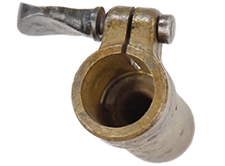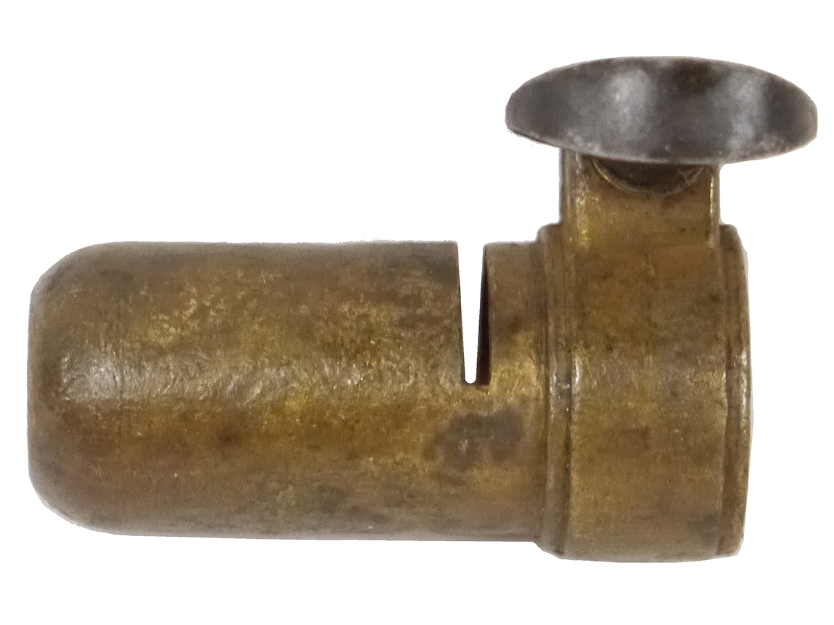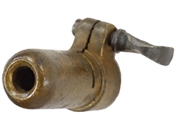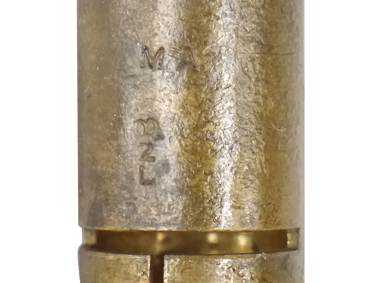 ビッカース重機関銃に使用されるMk I マズル・プロテクターです。 本体は真鍮製でクランプ・レバーを締めこむ事によって銃口に固定されます。 Mk I マズル・プロテクターはプルスローを使った清掃時にマズル・クラウンを保護する為に使用されました。 経年による擦れやグリスの付着が見られるものの、大きな破損はは無く程度は良好です。 クランプ・レバーも問題なく作動し、締めこむ事ができます。 本体には「MA」「王冠にZL」と読める刻印も確認できます。 (TK)