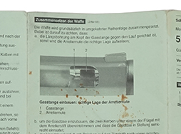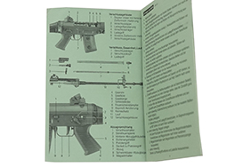 スイス軍 SIG Stgw.90(SG550)マニュアル(ドイツ語)です。 ポケットサイズでアコーディオン・ブック(折り本)形式のマニュアルです。 表紙を含め12ページの構成で、各部の名称や狙点の解説には写真やイラストが掲載されています。 若干の汚れや角部に折れが見られますが、大きな破れはありません。 (TK)