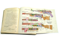 Waffen und Schiesstechnischer Leitfaden、1944年発行、200mm×130mm、567頁警察で使用したKar.98k、P-08拳銃、MP28短機関銃、ZB26軽機関銃、MG08重機関銃等の火器の説明を中心に信号銃、手榴弾、ガスマスク、馬具にいたるまで写真や図解を使って紹介されています。 568頁、経年によるダメージが見られますが資料価値の高いしっかりとした品です。