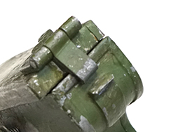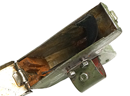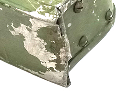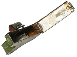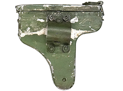 少々使用感があり、明るいグリーンのペイントは所々で剥落しています。蓋の蝶番部が変形しているため、開閉に難があります。その点が少々気になりますが、その他に大きな欠点はみられず、銃架への取り付けに問題はありません。(YS)