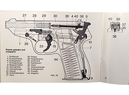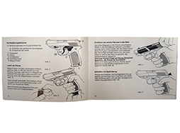 タイトル(Walther P5 Bedienungsanleitung=ワルサーP5取り扱い手引書)。1970年代後半にWalther社から銃の付属品として発行されたマニュアルです。全19ページのほぼ全てにイラストが掲載されており、構造、使用方法が詳しく解説されています。独語。準未使用品。