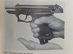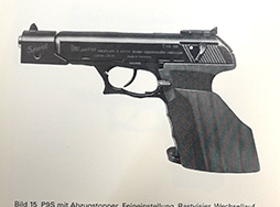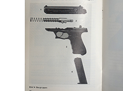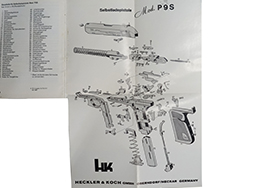 表紙にはドイツ語でSelbstladepistole Mod.P9S HK, Kaliber 9mm×19,Heckler & Kochと入っています。 赤黒の二色刷りで使用方法の詳細イラスト・分解図があります。巻末にはイラスト入り大版パーツ・リストがあります。サイズは160mm×115mm、全24頁の内約80%以上にイラストもしくは、写真入り。ほぼ全て準未使用状態ですが若干保管の時代が付いています。全独語、1978年発行。