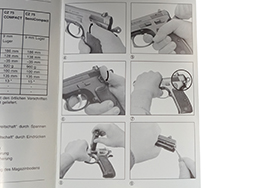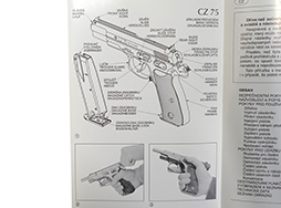 Ceska Zbrojovka社発行。 表紙にはNAVOD NA POUZITI, CZ75, INSTRUCTION MANUAL, BEDIENUNGSANLEITUNGとタイトルがあります。 表裏表紙はカラー、内容白黒43貢。 分解図と操作方法の写真ありますが、他は全て文字。 チェコ・英・独3カ国語。