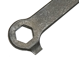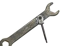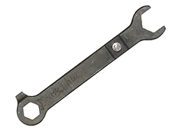 M60コンビネーション・レンチです。 固着グリスの付着によって判別しづらくなっていますが、7790680 95Dとメーカーロゴと思われるモールドが確認できます。 全体的にパーカー仕上げは残っており、各ツールの欠けなども見られません。 (TK)