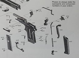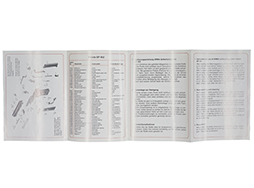 Erma EP452、Kal.22LR、Seibstladepisutole 英独仏語、12cmx17cm、広げると約48cmx17cm(表裏両面に印刷)、分解図あり。 表紙右上に書き込みがあるほか、若干の日焼けは見られるものの、全体としてはきれいな状態を留めています。 (TM)