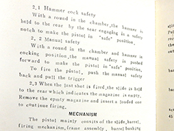 中国製、9mm Pistol、Model213、Operation、英語。18cmx13cm、全6頁、分解図あり。