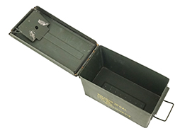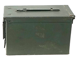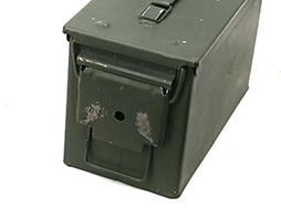 - アイテム説明米軍で使用されているM2A1 弾薬箱です。 12,7mm弾ならば105発、7,62mm弾ならば600発、5,56mm弾ならば840発収納可能です。 側面にはM2A1 S.C,F,のモールドが入っています。 本品は正面に「100 CARTRIDGES CAL.50 BALL M33 LINKED M9」のステンシルがあり、M9メタルリンクに装着されたM33ボール(普通)弾が100発収納されていたことが分かります。全体的にはグリーン塗装が残っています。 蓋の開閉やロックに機能的問題はありません。 (MD)