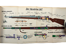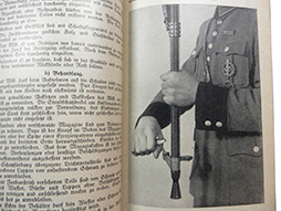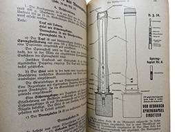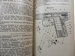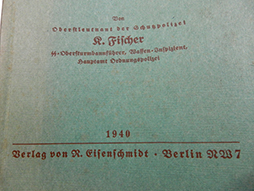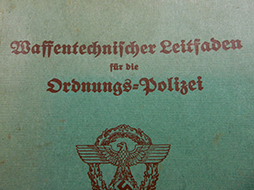 Waffentechnischer Leitfaden fur die Drdnungspolizei、1940年発行です。 大戦初期秩序警察で使用したKar.98k、P-08拳銃、MP28短機関銃、ZB26軽機関銃、MG08重機関銃等の火器の説明を中心に信号銃、手榴弾、双眼鏡、狙撃銃用のスコープ、コンパスの使用法、ガスマスク、馬具にいたるまで写真や図解を使って紹介されています。 436頁、経年による変化等は見られますが資料価値の高いしっかりとした品です。(AW)