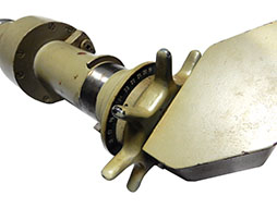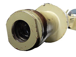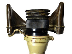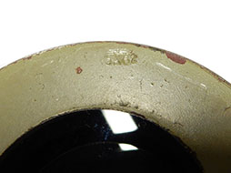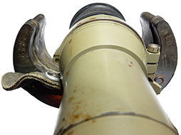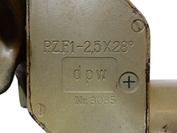 本体左側面には「P.Z.F.1-2.5x28°dpw Nr.3085」の刻印が見られます。 鉄が露出している箇所等に表面錆が見られますが、オリジナルのタン塗装は小傷が少なく鮮やかに残っています。 視界に若干の曇りが散見されますが充分に見通す事ができます。 レティクルも確認する事が出来ますが、本来ですとレティクルと連動する中央のエレベーション・リングが固着して動かない状態です。 接眼部の視度調節リングは健在です。