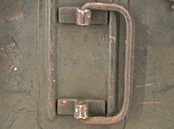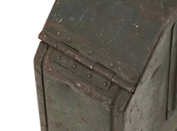 オリーブグリーン塗装には剥落と表面錆が散見されますが、こちらは全体の9割ほどでグリーン塗装が残っています。 塗装の剥落した箇所には錆止めの赤い下地塗装が覗いています。 アモベルトの通る箇所の可動式カバーの軸には僅かに変形が見られ、蓋の戻りがやや弱っていますが、固着等は無く問題なく動かすことが可能です。 取手部分はやや動きが硬いものの、問題なく動かすことが可能です。 取手部分にはやや塗装の剥落や錆が散見されます。 取手下部付近に「SNA」のロゴと「1940」の生産年刻印、「WaA48」の刻印が見られます。 細かな打ち傷や凹みが見られますが、大きなものは無くシルエットは完全です。 蓋のロック金具も健在で、機能的な問題は見られません。 (TK)- 詳細画像