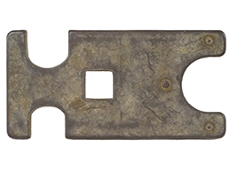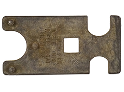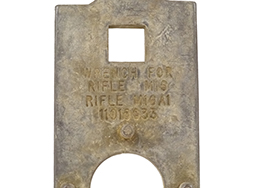 - アイテム説明M16用の1枚のプレートに複数の機能を合わせたコンビネーション・ツールです。 プレートと言っても約6mmの厚さと重量250gあり、なかなかの存在感です。 バレル・ナット用の3箇所の突起、エクステンション・チューブ、フラッシュ・ハイダーを外す際に使用します。 中心付近にはトルク・レンチに接続する為の四角い穴が開けられています。 本体は保管に伴う若干の擦れや油染み等が見られますが、全体的にパーカー仕上げが良好に残っており、「WRENCH FOR RIFLE M16 RIFLE M16A1 11010033」の刻印が見られます。 付属の銀紙(内側は油紙となっています)には角部やバレル・ナット用の突起による穴が空いている箇所が見受けられますが、ツール本体に大きな破損や傷は見られません。 M16好きの方には無くてはならないツールと言えるでしょう。 (TK)