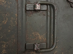 塗装はオリーブグリーンの上からサンド・カラーがオーバースプレーされた痕跡が見られます。 サンド塗装には全体的に剥落が見られ、取手周辺に僅かに残っています。 オリーブ・グリーン塗装にも剥落と錆が見られますが、こちらは全体の9割ほどで塗装が残っています。 アモベルトの通る箇所の可動式カバーのバネのテンションは弱っていますが、固着等は無く問題なく動かすことが可能です。 取手部分はやや動きが硬いものの、問題なく動かすことが可能です。 取手下部付近に「WECo」と読めるロゴと「1940」の製造年刻印が見られます。 右側面下部の目立たない位置に一箇所小さな凹みが見られる程度で、その他大きな凹みはありません。 蓋のロック金具も健在で、機能的な問題は見られません。 (TK)- 詳細画像