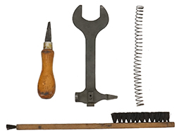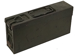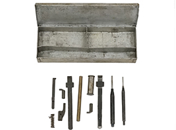 - アイテム説明MG13 ガンナーズ・キットです。 MG34/42共用の250連弾薬箱の中にMG13用の工具類が収納されています。 内容物は装弾器、コンビネーション・レンチ、専用ドライバー、大型ブラシ、布、対空射撃時に使用するサングラス(黒レンズ)及び曇天時用サングラス(黄レンズ)、フラッシュ・ハイダーと収納缶、スペアパーツ・ケース(各種ポンチ等入)となっています。 弾薬箱 (収納ケース)上面には再塗装によりやや刻印が判別しずらくなっていますが、1938年にBerlin-Suhler Waffenfabrik(Gustloff-Werkeの前身企業)で製造されたことを示す「BSW 1938」とアムト刻印が確認できます。 コンビネーション・レンチにもBSW 1938」とアムト印が打たれています。 装弾器には薄っすらと表面錆が見られ木製ハンドルに欠けがありますが、可動部に関しても動きはスムーズです。 対空射撃時に使用するサングラス(黒レンズ)にはブリッジ部分に破損が見られ、左右で分かれてしまっています。 もう一組のサングラス(黄レンズ)には破損は見られず、経年によりゴムが伸びていますが比較的しっかりとした状態です。 フラッシュ・ハイダーにはやや銃口部に擦れが見られるものの、大きな歪み等は見られません。 専用ドライバーは刃先にやや欠けが見られます。 その他収納物に関しても経年に伴う擦れ等が見られますが、概ねしっかりとした状態が保たれています。 (TK)