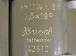 - アイテム説明装甲監視所用ペリスコープ (Pz.B.W.F.8)です。 ブンカー(装甲監視所)の上に付いている小さなドーム型の監視窓に取り付けて使うペリスコープで、装甲が20cm以上のものに対応しています。 オリジナル・ペイントが良く残った全体的に保存状態の良い品です。 大戦中のドイツ軍光学機器メーカーとして有名なRathenowにあったBusch社製で、Buschのロゴが入っています。 本体先端のガラス製保護カバー内部に小さなヒビ割れがあります。本体にPz.B.W.F.8、2,5x19、 Busch(ロゴ)、Rathenow、42613の刻印があります。 顔面への緩衝具も完全な形で付属しています。