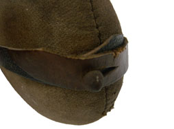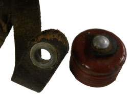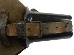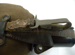 独軍の1931年型水筒で、ベークライト製のコップ付きです。 本品は本体の通常フェルト製のカバーで覆われている部分が布製になっています。 内蓋を留めるストラップのリベットが外れています。 布全体に染みと汚れ、小さな穴が比較的目立たない箇所に一カ所あります。 金属部分全体的に錆がでています。 革部分は乾いてしまっているので、実用には不向きです。