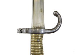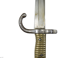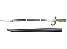 フランス シャスポーM1866小銃用の銃剣です。鍔と鞘に9378のシリアルナンバーがあります。剣身は15cm以下に切断された合法品です。切断された剣先が付属します。部分的な錆等が見られますが、大変良好な状態の品です。