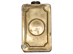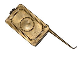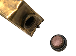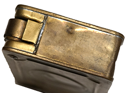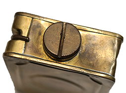 MG15 大型オイラーです。 角型のオイラーに折り畳み式ノズルが格納されています。 ノズルの収まる凹み部分には1の刻印が見られます。 真鍮製で外装には若干のくすみや凹みが見られますが、大きな変形はなくノズルの可動やキャップの取り外しは問題なく行うことが可能です。 (TK)