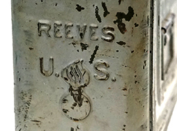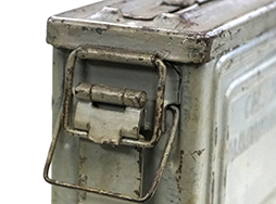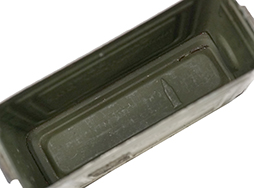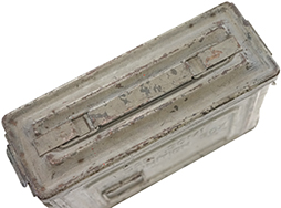 - アイテム説明M1919 ,.30口径機関銃などに使用されるM1 弾薬箱です。 表面は米海軍の艦艇色を思わせるグレーで再塗装が施されており、角部を中心に塗膜の剥落や錆が見られます。 塗装が剥がれた箇所には元のOD塗装が覗いています。 蓋裏はグレー塗装が施されていますが、弾薬箱内部はOD塗装のままとなっています。 弾薬箱正面および裏面のCAL. .30M1 AMMUNITION BOX、側面のREEVES U.S.とフレイミング・ボムのモールドもしっかりと確認できます。 全体に塗装の剥落や錆が見られるものの、凹み等の大きなシルエットの崩れはありません。 (TK)