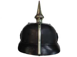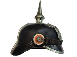 全ての歩兵連隊は円形ではなく十字のスパイク基部が付き、その十字のスパイクには縁取りがされず、スパイクには段差が入っています。 このような特徴があるために、現存数が多いプロイセン王国のヘルメットを改造して(前章を取り替えて)ヘッセン大公国軍用に見せかける事が出来ないようになっています。 本品は勿論その特徴をそのまま表した100%間違いないヘッセン大公国軍用です。 弊社代表は帝政ドイツのスパイク・ヘルメット研究家で、士官ヘルメットを専門に集めています。 同じヘルメットは一つもなく全て異なった200個近いコレクションの中にも、この第115近衛歩兵連隊のヘルメットはありません(1621年のリボンの無い第23竜騎兵連隊士官はあり)。