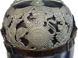 - アイテム説明本品はヘッセン大公国を代表する第115近衛歩兵連隊 「Leibgarde-Infanterie-Regt. (1. Grossherzoglich Hessisches) Nr.115 XVIII Armee Korps」の下士官兵卒に第一次世界大戦中に支給された官給品スパイク・ヘルメットです。 ヘッセン大公国の第115近衛歩兵連隊は同大公国で唯一の近衛星章(Star of the Order of Ludwig without swords)を前章に付ける事を許されたドイツ帝国内でも有名なエリート連隊ですので、その星章に星章に「GOTT EHRE VATERLAND」と入った前章を見ただけで第115近衛歩兵連隊と判ります。 連隊駐屯地はヘッセン大公国の首都Darmstadtで1621年3月1日に「Kompanie Dressler」として創設されたドイツ帝国の中で最も古い歩兵連隊です。 1630年に「Furstliche Leib-Kompanie」となりました。