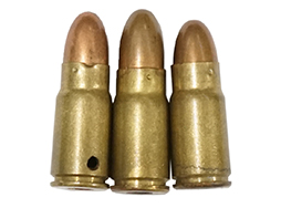 - アイテム説明十四式拳銃、九四式拳銃や一〇〇式機関短銃用に使用された十四年式拳銃実包(8mm×22)弾 ダミーカートです。 薬莢・弾頭共に大戦中の旧軍で使われた軍用です。 弾頭はメッキと銅被甲のバリエーションがあり、薬莢は真鍮製となっています。 表面に若干のくすみが見られるなど、コンディションは個体によって微妙に異なりますが、どの個体も大きな凹みや破損はありません。 個体によっては薬莢側面に安全処理の穴が開いている場合があります。 雷管に打撃痕のある、装薬(火薬)の入っていない安全品です。 (TK)