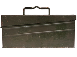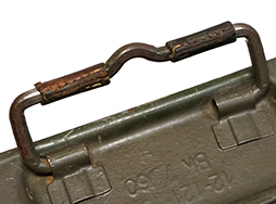 本体はOD色です。 蓋上面には「12-121-1508」などの文字がプレスモールドにて表記されています。 所々に傷や錆、一部に凹みが見られますが、その他大きな破損等は見られません。 蓋の開閉も問題ありません。 カンヌキ式のロック金具も機能的な問題は見られません。 各取手部分の革製タブは健在でOD塗料が塗られています。 現物と画像の品は異なります。 (AW)- 詳細画像
