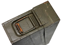 - アイテム説明MG3に使用する金属製の弾薬箱です。 第二次世界大戦中のMG34/42用弾薬箱に類似していますが、使用弾薬の識別用に本体側面に2本のリブが入っていることが特徴です。 また、大戦型の弾薬箱と比べて薄い鉄板が使用されています。