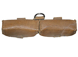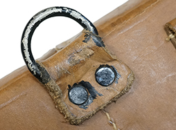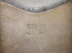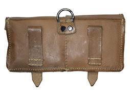 - アイテム説明Gew.43およびKar.43に使用されるマガジン・パウチです。 本品は茶色の革製で、背面のベルト・ループも茶色革製となっています。 また、背面にはサスペンダーと接続するためのDリングが装着されており、Dリングの留革に関しても同様に茶色となっています。 本品のパウチ外側には「cny 1945」の打刻が見られ、1945年にBerlinのC. Pose社によって製造されたものと思われます。 革生地には若干の乾燥や皺、染み等が見られるほか、Dリングの留革は若干の劣化が目立ちますが、縫い目の解れや強度に影響を及ぼす破損等は全体的には見られません。 パウチ下部および背面の金具に黒色の塗料が塗られていますが、金具付近及び向かって右側のフラップなどにも付着しています。 パウチには保管に伴う若干の型崩れが見られるものの、マガジンの収納には問題ないものと思われます。 (TK)(TM)