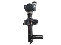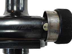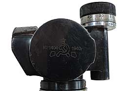 本品の対物レンズ・ユニット側面にはシリアルNo.21404と製造年の1940、第69計器設計工場を示す「鎌とハンマーの横に2つの五角形」の刻印が打たれています。 反対面には緊急用水準器を取り付けるマウントがありますが本品に水準器は付属せず、取り付け用のネジが3本締められています。 対物レンズ・ユニットは中央部のレバーを起こすことでフリーになり、360°回転させることが出来ます。 その他、仰俯角ダイヤル、左右微調整ダイヤルも機能しており、実際に調整することが可能です。 接眼レンズ側面にはイルミネーター用の窓があり、光を当てることでレティクルが鮮明に発光します。 レンズ内部にはチリや薄いカビの発生が見られやや視界に曇りが見られますが、はっきりとレティクルが見え、狙いをつけることが可能です。 対物/接眼レンズには傷や割れも見られません。 外装には若干の小傷や薄っすらとした表面錆が見受けられるものの、全体的に黒染め仕上げが残った、概ね良好な状態が保たれています。 本商品に関するブログがございますので、詳しくは>>こちらの記事をご覧ください。(TK)- 詳細画像