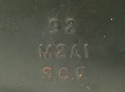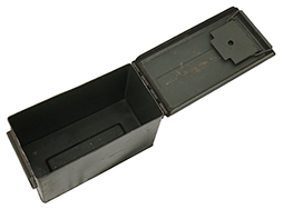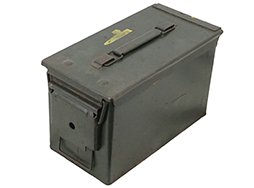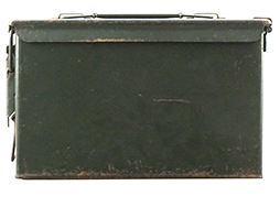 - アイテム説明米軍で使用されているM2A1 弾薬箱です。 12,7mm弾ならば105発、7,62mm弾ならば600発、5,56mm弾ならば840発収納可能です。 側面には92 M2A1 S.C,F,のモールドが入っています。 本品は正面に「100 CARTRIDGES CAL.50 BALL M33 LINKED M9 LC-92G505-297」のステンシルがあり、M9メタルリンクに装着されたM33ボール(普通)弾が100発収納されていたことが分かります。 蓋上部や取手部、底部にはやや表面錆が散見されますが、全体的にはグリーン塗装が残っています。 また、蓋のヒンジ部周辺に黄色スプレーが吹かれています。 蓋の開閉やロックに機能的問題はありません。 (TK)