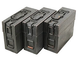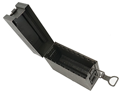 - アイテム説明MG13 マガジン収納箱です。 MG13の20連マガジンを8本収納することが出来ます。 蓋上部にはBerlin-Suhler Waffenfabrik(Gustloff-Werkeの前身企業)製を示す「BSW 1938」とアムト刻印が見られます。 再塗装により一部塗膜が厚くなっている箇所が見られ、箱本体には打ち傷や角部が擦れにより地金が現れていますが、全体的なシルエットは完全です。 箱内部でマガジンを押さえる木製板も残っています。 ロック金具に機能的な問題は見られず、側面の金具に付けられた革も健在です。 (TK)