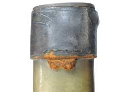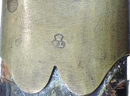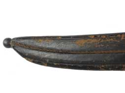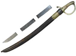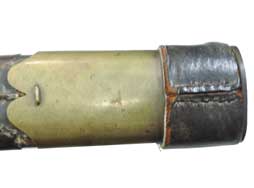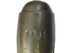 柄は真鍮による一体成型となっており、鞘は黒色の革製となっています。 鍔の先端が半球と台座を組み合わせた独特の形状をしているのが特徴です。 柄の表面には36本の溝が設けられており、柄の中心部でリベットにより刀身が固定されています。 鞘の鯉口付近には真鍮製の補強用バンドが取り付けられています。 この真鍮バンド表面には小さく王冠とFLの文字を組み合わせた刻印が入っています。 柄部分は真鍮表面の経年変化により良い時代感が出ており、若干の打ち傷は見受けられますが目立った破損等はなく比較的良好な状態です。 柄部分には星とAを組み合わせた刻印が見られます。 刀身表面には一部朽ち込み跡が散見されますが、刀身基部の「No 1」及び「L」という刻印は鮮明に残っています。 真鍮バンドの周囲には革製の剣吊が巻き付けられていますが、残念な事に吊り紐の一部が欠損しております。 鞘及び柄を含めた全長は約74cmで、剣身は各々約14cm以下になるよう3本に切断されており、切断された刀身が付属いたします。 (KK)- 詳細画像