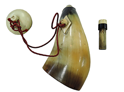 - アイテム説明火薬入れは早盒への火薬の装填、もしくは早盒を使用しない場合は銃口から火薬を直接装填する為に用いられた品です。 火縄銃などの先込め(前装)式銃砲に使用されました。 火薬入れの蓋の多くはその銃1発分の火薬が測れるようにスケールの用途を兼用しています。