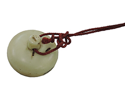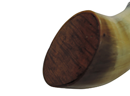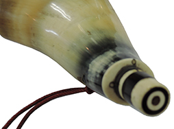 本品は象牙色の牛角製で本体の高さ約19cm、幅約8cm、厚さ約5cmです。 本体以外の注ぎ口、蓋が水牛の角又は動物の骨製になっています。 象牙色の動物の骨製の根付が赤色の時代紐で本体と繋がっています。 本体側の紐の付け根は凝った菱型座になっています。 本体に左側面に一ヵ所当たりによる欠けがあります。 この点を除けばとても状態の良い商品です。