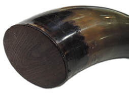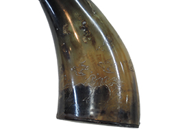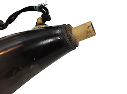 本品は水牛角製で本体の高さ約19cm、幅約9cm、厚さ約6cmです。 側面に波高い岩壁に千鳥が漂う図案が彫られています。 岸壁は水牛角特有の模様に合わせて彫られており、上が暗く、下が赤みのある黄褐色の天然のグラデーションがまるで夕刻の空のようで、自然素材を最大限活かした見事な意匠に心奪われます。 底面のみ木製で美しい木目を呈しています。 本体以外の注ぎ口、蓋が水牛の角又は動物の骨製になっています。 注ぎ口の付け根に木製の八幡座が備えてあります。 鹿革製の弾袋と栗型の木彫りの根付が消炭色の時代紐で本体と繋がっています。 弾袋には円形鉛玉が2個入っています。 本体側の紐の付け根は動物の骨製の八幡座になっています。 本体底面や注ぎ口の付け根に小さな欠けが見られますが、いずれも外見を大きく損なうものではありません。
