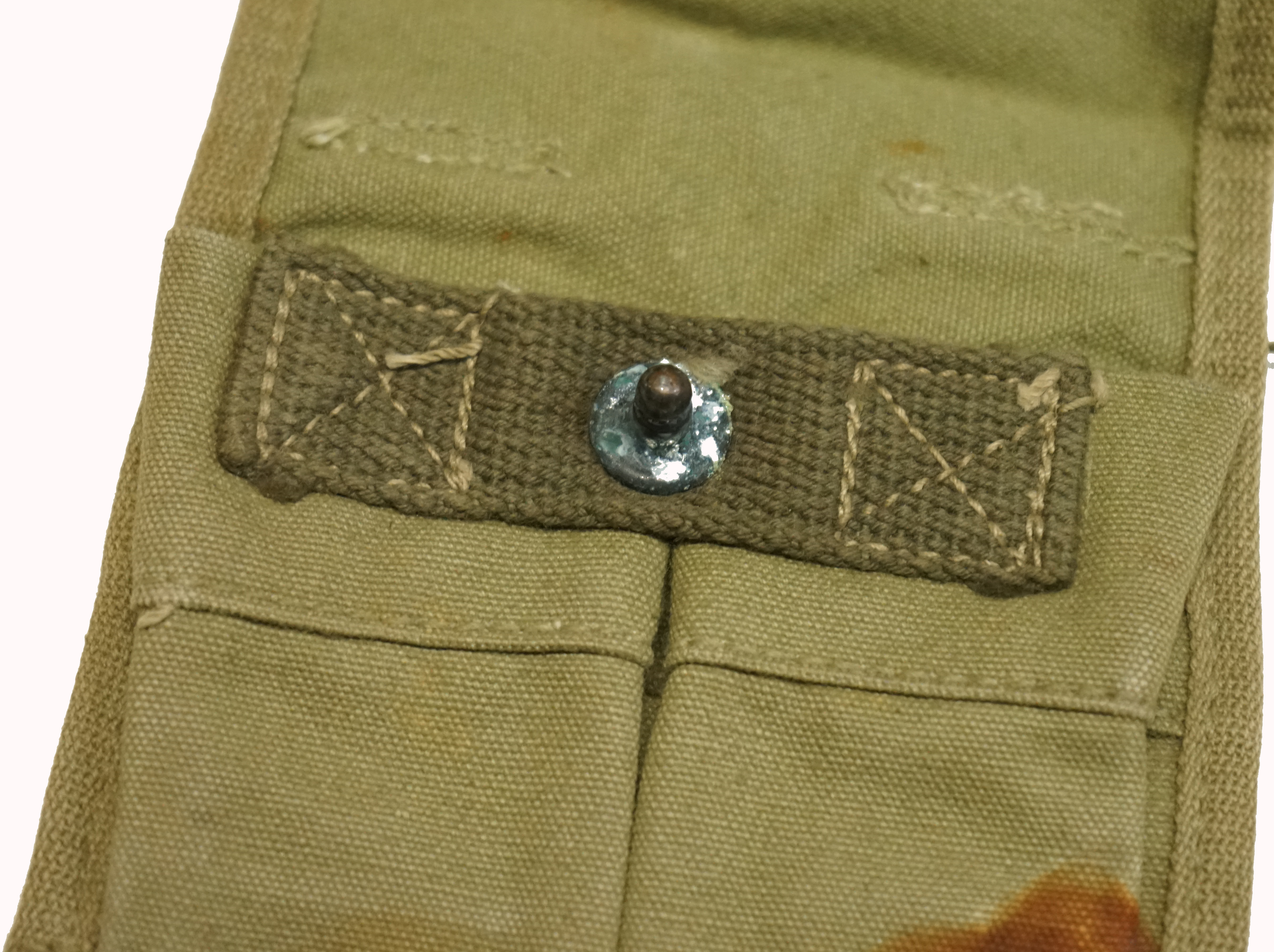 スナップ・ボタンとリフト・ザ・ドットなどの金属部は緑青が目立ちますが機能は問題なく機能します。スナップ・ボタン付近の染みが裏側までありますが、布自体は劣化は比較的少なく、開閉も問題なく行えます。(WH)- 詳細画像