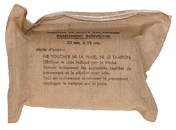 イギリス軍の包帯です。 未開封の品で、パッケージに英語とフランス語で使用説明が印刷されており、DEC 1973のスタンプが押されています。 外装にはやや経年に伴う汚れが見られます。 未開封品のため内部の包帯のコンディションは不明です。 パッケージ内には包帯を留める安全ピンが入っているようで、一部硬い感触があります。 (MD)(TK)
