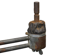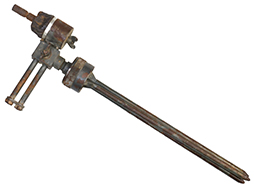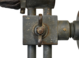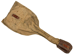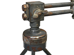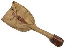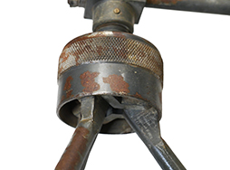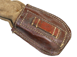 - アイテム説明第二次世界大戦中のドイツ軍光学機器用のポータブル式三脚です。 高さが約45cmしかありませんので、机の上などの台に乗せて使用するか、地面に伏せて使うかすると思われます。 あくまでも補助的に使用する品です。 大型の光学機器ですと安定性にかなり問題があると思われます。 取り付けられる光学機器の種類は標準的な軸径(約13.5mm)用であれば使用できます。 脚1本の長さは約36cmでその上に光学機器を載せる台座があります。 軸と台座は「ボール・ジョイント」になっており軸の角度を調整出来ます。 また、その「ボール・ジョイント」部分に革製の覆いがあり、若干の傷みが見られます。 「ボール・ジョイント」の作動、三脚の開閉には問題はありません。 この台座はネジの調節によって約8.5cm水平方向への移動可能です。(←この調整ロック用ネジは固いです。) 底部分に革の補強、ベルト&バックル部分も革製になっているカーキ色キャンバス製ケースに入っています。 ケース裏には革のベルト・ループが二箇所付いています。 本体全体的に錆が出ており、ケースのキャンバス部分も錆染みと汚れがあります。