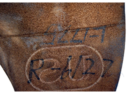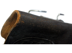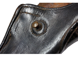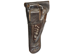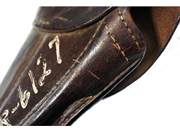 フック部分の金具は仕上げがほぼ完全に落ちて金属の地肌が現れています。 他の金具については時代が出ていますが、目立った腐食などは見られず、革ホルスターによく見られるフラップを留めるギボシ部周辺の腐蝕脱落などもありません。 裏面に白い塗料で手書きの数字が書かれている他、フラップの内側にも手書きで同様の数字が記入されています。 (KK)- 詳細画像