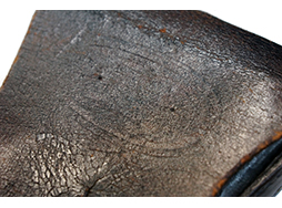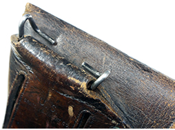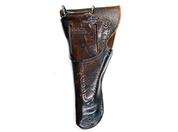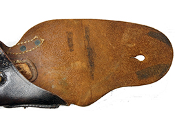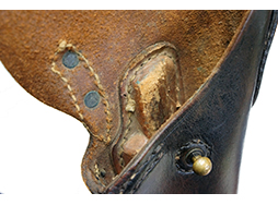 革の状態は全体に使用感及び経年による擦れが見られ、フラップ部分の表面には細かな皺が見られます。 フラップ自体は適度な柔らかさを保っており、比較的しっかりとした状態が保たれています。 革の表面には一部に黒色塗料が塗られていた痕跡が見受けられます。 フラップに打刻されているUSのマークは非常に薄くなっており、USマークの上から何らかの記章を縫い付けていたと思われる針穴が2カ所見られます。 フラップの付け根部分には経年に伴う細かなひび割れが見受けられますが、現状では強度的に問題のないレベルです。 フック部分の金具は仕上げがほぼ完全に落ちて金属の地肌が現れています。 他の金具については時代が出ていますが、目立った腐食などは見られず、革ホルスターによく見られるフラップを留めるギボシ部周辺の腐蝕脱落などもありません。 本体裏側下部のハトメ部分に一部割れが見られます。 ホルスター内部は銃の出し入れに伴って革の表面が荒れている箇所が見られます。 (KK)- 詳細画像