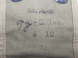 .45口径 M1911ピストル用の2連マガジン・パウチです。 ほぼ未使用品の品ですが若干の経年変化が見られます。 ボタンの開閉もスムーズです。 フラップ内側に6376、メーカー、4 18の検印や手書きの98の数字が見られます。 (AW)