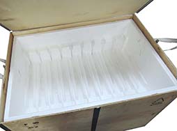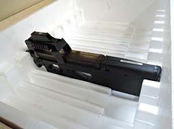 FN社から発送されたことが分かる表示が貼付されており、20挺収納することが出来ますが外面のステンシルが15挺に修正されていることから、納品する際15挺のみ収納されていたものと思われます。内側の発泡剤が1か所小さくかけていますが、それほど気になるものではありません。 使いまわしはあまり考慮されていない造りとなっており、蓋の蝶番に当たる部分が単なる金属板の為、3ヵ所のうち2ヵ所が既に断裂しています。繰り返し開閉すると残りも金属疲労によって断裂してしまう可能性がございます。 (YS)- 詳細画像