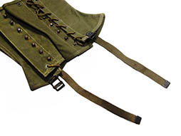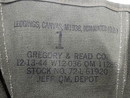 - アイテム説明1938年に制式となったアメリカ軍のM1938レギンスです。 アンクルブーツと組み合わせてヨーロッパ、太平洋戦域において広く使用されました。 OD色の1944年製の破損等が見られない程度の良い品ですが金属部に経年の変化が見られます。「LEGGINGS, CANVAS, M1938, DISMOUNTED(O.D.)(一行目)」「1(二行目)」 「GREGORY & READ CO.(三行目)」 「12・13 44 W12-036 QM 11285(四行目)」 「STOCK NO.72-L 61920(五行目)」 「JEFF.QM.DEPOT(六行目)」と左右共に鮮明に検印が確認できます。 (AW)