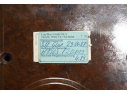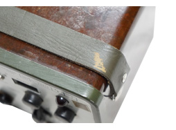 ポータブル・バッテリーと共に携帯し、裏面の検知部によって放射線を測定します。 加えて外付けのスピーカーを取り付けることで、警告音を発することも出来ました。 本品は本体のみで、使用感は少なく程度の良い印象ですが、実際に動作の確認は出来ていないため、その点ご考慮ください。 各ダイヤルは強いクリック感を残しており、ボタンのゴムはしなやかな弾力を残しています。上部の革製のストラップも同様に柔らかさが残っていますが、1ヵ所擦れが見受けられます。 また裏面にもクッションとなるゴムが2ヶ所取り付けられていますが、片方が千切れかかっているため取り扱いには注意が必要です。 表面に1ヵ所「E」のマーキングがされており、裏面には管理票と思われるシールが張られています。 原因は不明ですが、傾けると中で何かがカラカラと音を立てます。 (YS)- 詳細画像